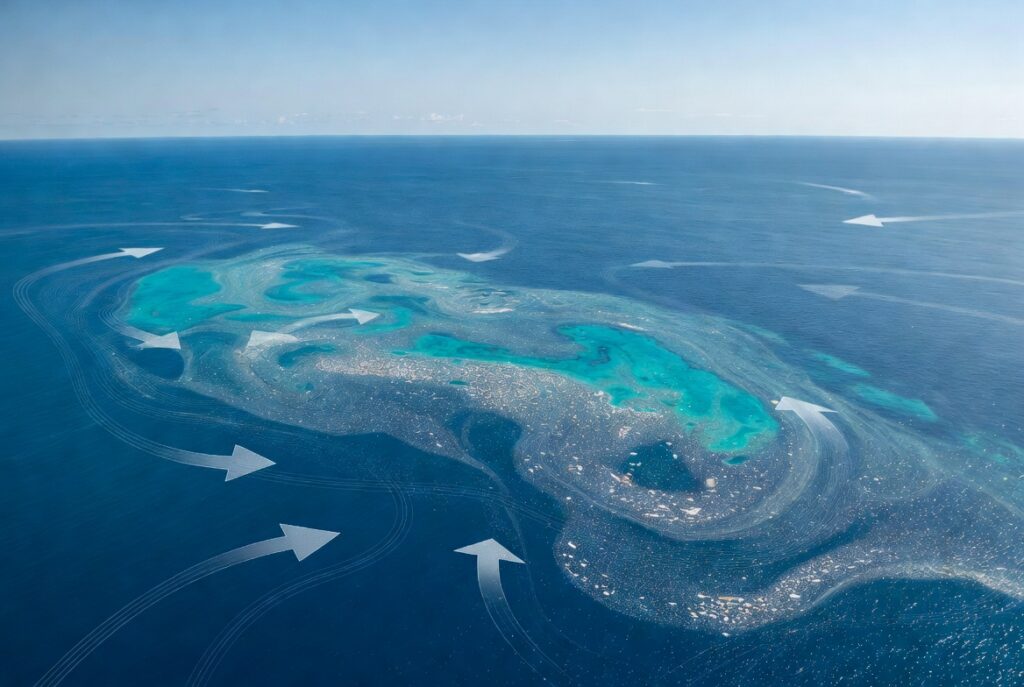 The patch forms primarily within the gyre bounded by the North Pacific Current, the California Current, the North Equatorial Current, and the Kuroshio Current. These rotating currents create a region of weak horizontal mixing and convergent surface flow. From a fluid dynamics perspective, Ekman transport plays a central role: wind-driven surface layers move at an angle to prevailing winds, resulting in net inward transport toward the gyre center. The result is a quasi-stagnation zone where buoyant debris accumulates over decades.
